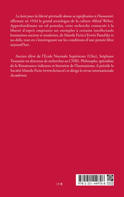 La lutte pour la liberté spirituelle donne sa signification à l’humanité, affirmait en 1944 le grand sociologue de la culture Alfred Weber. Approfondissant un tel postulat, cette recherche consacrée à la liberté d’esprit emprunte ses exemples à certains intellectuels humanistes anciens et modernes, de Marsile Ficin à Erwin Panofsky et au-delà, tout en s’interrogeant sur les conditions d’une pensée libre aujourd’hui.