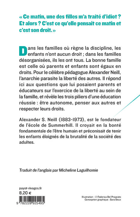 Dans les familles où règne la discipline, les enfants n'ont aucun droit ; dans les familles désorganisées, ils les ont tous. La bonne famille est celle où parents et enfants sont égaux en droits. Pour le célèbre pédagogue Alexander Neill, l'anarchie parasite la liberté des autres. Il répond ici aux questions que lui posaient parents et éducateurs sur la jalousie, le mensonge, l'anorexie, la violence, l'exercice de la liberté au sein de la famille, et révèle les trois piliers d'une éducation réussie : être autonome, penser aux autres et respecter leurs droits.