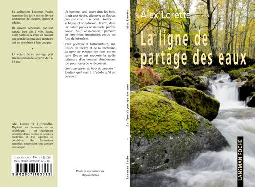 Un homme, seul, court dans les bois. Il suit une rivière, découvre un fleuve, puis une ville. Il se perd, il tombe, il se blesse et se redresse. Il erre dans une nature parfois accueillante, parfois hostile. Au fil de sa course, il parcourt un labyrinthe imaginaire, perdu au fond de lui-même. Récit poétique et hallucinatoire, aux limites du théâtre et de la littérature, La ligne de partage des eaux est un texte fleuve qui rapporte la quête intérieure d'un homme abandonnant tout pour tenter de se découvrir. Que trouvera-t-il au bout du parcours ? L'enfant qu'il était ? L'adulte qu'il est devenu ? Alex Lorette vit à Bruxelles. Diplômé en économie et en sociologie, il est également détenteur d'une licence en sciences théâtrales et d'un diplôme de comédien. Ses formations multiples nourrissent son écriture dramatique.