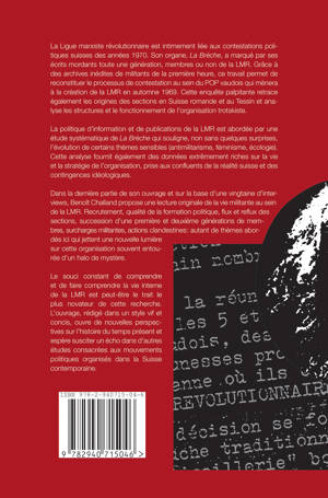 La politique d'information et de publications de la LMR est abordée par une étude systématique de La Brèche qui souligne, non sans quelques surprises, l'évolution de certains thèmes sensibles (antimilitarisme, féminisme, écologie). Cette analyse fournit également des données extrêmement riches sur la vie et la stratégie de l'organisation, prise aux confluents de la réalité suisse et des contingences idéologiques. Dans la dernière partie de son ouvrage et sur la base d'une vingtaine d'interviews, Benoît Challand propose une lecture originale de la vie militante au sein de la LMR. Recrutement, qualité de la formation politique, flux et reflux des sections, succession d'une première et deuxième générations de membres, surcharges militantes, actions clandestines : autant de thèmes abordés ici qui jettent une nouvelle lumière sur cette organisation souvent entourée d'un halo de mystère.