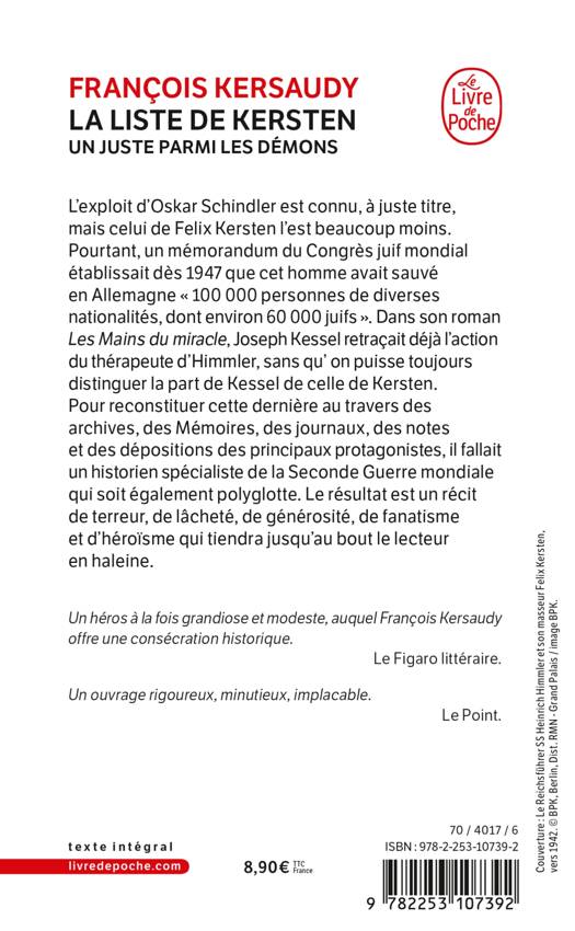 L’exploit d’Oskar Schindler est connu, celui de Felix Kersten l’est beaucoup moins. Pourtant, un mémorandum du Congrès juif mondial établissait dès 1947 que cet homme avait sauvé en Allemagne « 100 000 personnes de diverses nationalités, dont environ 60 000 juifs ». Dans son roman Les Mains du miracle, Joseph Kessel retraçait déjà l’action du thérapeute d’Himmler, sans que le lecteur puisse toujours distinguer la part de Kessel de celle de Kersten. Pour reconstituer cette dernière au travers des archives, des mémoires, des journaux, des notes et des dépositions des principaux protagonistes, il fallait un historien spécialiste de la Seconde Guerre mondiale qui soit également polyglotte. Le résultat est un récit de terreur, de lâcheté, de générosité, de fanatisme et d’héroïsme qui tiendra jusqu’au bout le lecteur en haleine.