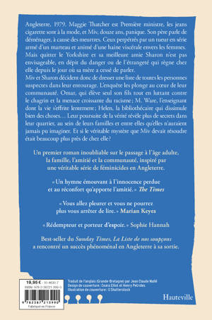 Miv et Sharon décident donc de dresser une liste de toutes les choses suspectes dans leur rue. L'enquête les plonge au coeur de leur communauté. Omar, qui élève seul son fils tout en luttant contre le chagrin et la menace croissante du British National Front ; M. Ware, l'enseignant dont la vie et l'identité s'effritent ; Helen, la bibliothécaire qui cache ses propres secrets... Leur poursuite de la vérité révèle plus de secrets dans leur quartier, au sein de leurs familles et entre elles qu'elles n'auraient jamais pu imaginer. Et si le véritable mystère que Miv devait résoudre était beaucoup plus près de chez elle ?
