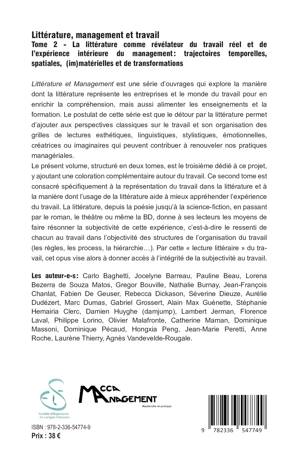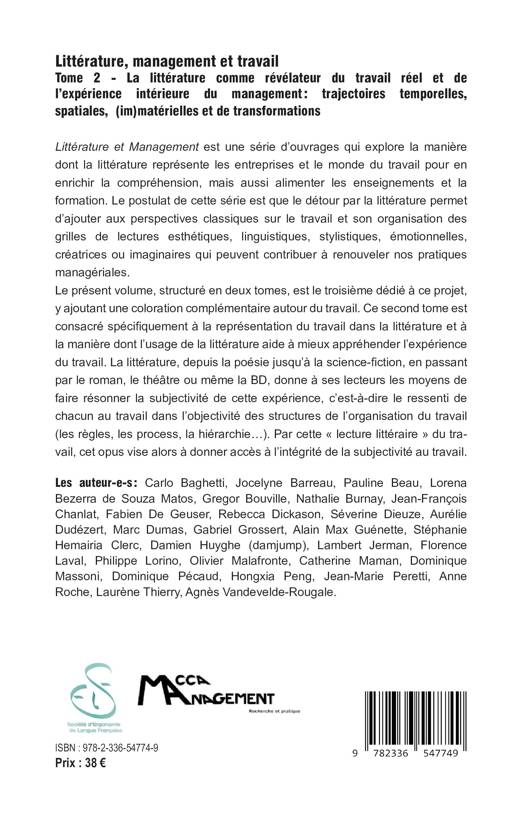 Littérature et Management est une série d'ouvrages qui explore la manière dont la littérature représente les entreprises et le monde du travail pour en enrichir la compréhension, mais aussi alimenter les enseignements et la formation. Le postulat de cette série est que le détour par la littérature permet d'ajouter aux perspectives classiques sur le travail et son organisation des grilles de lectures esthétiques, linguistiques, stylistiques, émotionnelles, créatrices ou imaginaires qui peuvent contribuer à renouveler nos pratiques managériales. Le présent volume, structuré en deux tomes, est le troisième dédié à ce projet, y ajoutant une coloration complémentaire autour du travail. Ce second tome est consacré spécifiquement à la représentation du travail dans la littérature et à la manière dont l'usage de la littérature aide à mieux appréhender l'expérience du travail. La littérature, depuis la poésie jusqu'à la science-fiction, en passant par le roman, le théâtre ou même la BD, donne à ses lecteurs les moyens de faire résonner la subjectivité de cette expérience, c'est-à-dire le ressenti de chacun au travail dans l'objectivité des structures de l'organisation du travail (les règles, les process, la hiérarchie...). Par cette lecture littéraire du travail, cet opus vise alors à donner accès à l'intégrité de la subjectivité au travail.