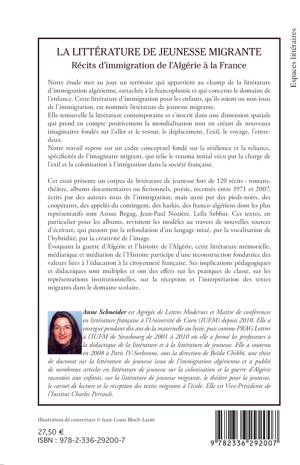 La littérature de jeunesse migrante renouvelle la littérature contemporaine et s'inscrit dans une dimension spatiale qui prend en compte la mondialisation tout en créant de nouveaux imaginaires fondés sur l'aller et le retour, le déplacement, l'exil, le voyage, l'entre-deux. Cet essai présente un corpus de 120 récits recensés entre 1971 et 2007, écrits par des auteurs issus de l'immigration, des pieds-noirs, des coopérants, des appelés du contingent, des harkis, des franco-algériens, dont les plus représentatifs sont A. Begag, J.-P. Nozière, L. Sebbar.