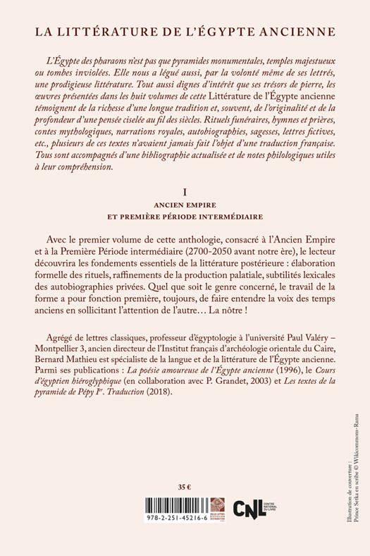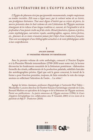 L'Egypte des pharaons n'est pas que pyramides monumentales, temples majestueux ou tombes inviolees. Elle nous a legue aussi, par la volonte meme de ses lettres, une prodigieuse litterature. Tout aussi dignes d'interet que ses tresors de pierre, les oeuvres presentees dans les huit volumes de cette Litterature de l'Egypte ancienne temoignent de la richesse d'une longue tradition et, souvent, de l'originalite et de la profondeur d'une pensee ciselee au fil des siecles. Rituels funeraires, hymnes et prieres, contes mythologiques, narrations royales, autobiographies, sagesses, lettres fictives, etc., plusieurs de ces textes n'avaient jamais fait l'objet d'une traduction francaise. Tous sont accompagnes d'une bibliographie actualisee et de notes philologiques utiles a leur comprehension. Avec le premier volume de cette anthologie, consacre a l'Ancien Empire et a la Premiere Periode intermediaire (2700-2050 avant notre ere), le lecteur decouvrira les fondements essentiels de la litterature posterieure: elaboration formelle des rituels, raffinements de la production palatiale, subtilites lexicales des autobiographies privees. Quel que soit le genre concerne, le travail de la forme a pour fonction premiere, toujours, de faire entendre la voix des temps anciens en sollicitant l'attention de l'autre... La notre !