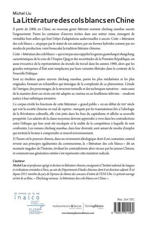 À partir de 2008, en Chine, un nouveau genre littéraire grand public suscite l’engouement : la « littérature des cols blancs », zhichang xiaoshuon. Parmi les centaines d’oeuvres écrites dans une même veine, émergent de véritables bestâseller qui font l’objet d’adaptations audiovisuelles à succès. Cette littérature, atypique par le statut de ses auteurs, par ses formes hybrides comme par ses modes de production, vient bousculer la tradition littéraire chinoise.<br /> À travers l’étude de l’intrigue, des personnages, de la structure textuelle et des techniques narratives de quatre oeuvres zhichang xiaoshuo parmi les plus médiatisées et les plus originales – un échantillon qui témoigne de la complexité du phénomène, et permet en passant de rendre justice à leur esthétique inventive –, Michel Liu révèle les fonctions de ce nouveau courant littéraire : rien moins qu’un mode d’emploi, invitant le lecteur en mal de repères à comprendre son nouvel environnement, celui d’une Chine qui, en ce début de XXIe siècle, se jette dans les bras du capitalisme et affiche sa nouvelle prospérité, au sein d’une société marquée par les traumatismes liés à l’idéologie de la Révolution culturelle. Les salariés de la classe moyenne doivent apprendre à vivre dans les contradictions entre l’éthique qui leur avait été inculquée et la réalité de la compétition à laquelle ils sont confrontés. C’est ainsi que la littérature des cols blancs dit un moment singulier de l’histoire.