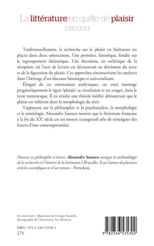 Traditionnellement, la recherche sur le plaisir en littérature est placée dans deux orientations. Une première, historique, fondée sur le regroupement thématique. Une deuxième, en esthétique de la réception, où l'acte de lecture est déconstruit au détriment du texte et de la figuration du plaisir. Ces approches circonscrivent les analyses dans l'héritage d'un discours historique et universalisant. Éloigné de ces orientations analytiques, cet essai interroge pragmatiquement le signe /plaisir/, sa circulation et ses usages, dans le texte romanesque. Il en résulte une théorie inédite démontrant que le plaisir est inhérent dans la morphologie du récit. S'appuyant sur la philosophie et la psychanalyse, la morphologie et la sémiologie, Alexandre Sannen montre que la littérature française à la fin du XXe siècle est un moyen transgressif afin de témoigner des heurts d'une contemporanéité.