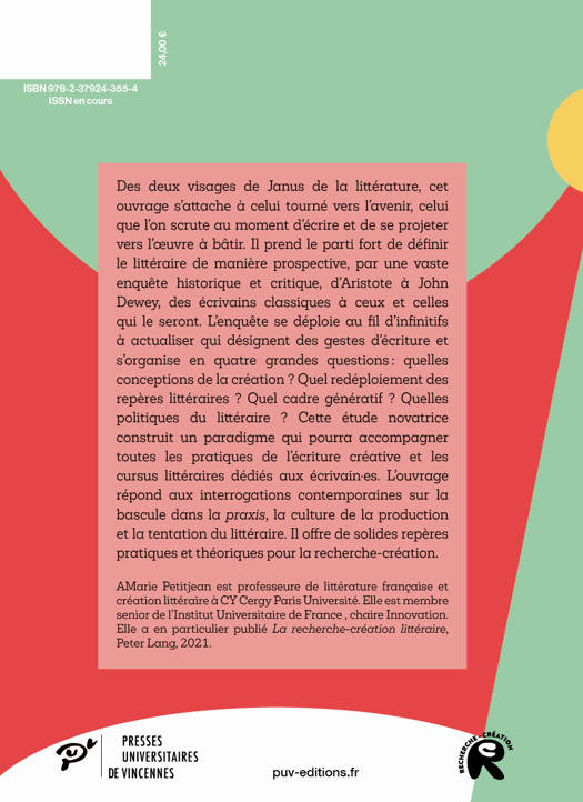 Des deux visages de Janus de la littérature, cet ouvrage s’attache à celui tourné vers l’avenir, celui que l’on scrute au moment d’écrire et de se projeter vers l’œuvre à bâtir. Il prend le parti fort de définir le littéraire de manière prospective, par une vaste enquête historique et critique, d’Aristote à John Dewey, des écrivains classiques à ceux et celles qui le seront. L’enquête se déploie au fil d’infinitifs à actualiser qui désignent des gestes d’écriture et s’organise en quatre grandes questions : Quelles conceptions de la création ? Quel redéploiement des repères littéraires ? Quel cadre génératif ? Quelles politiques du littéraire ? Cette étude novatrice construit un paradigme qui pourra accompagner toutes les pratiques de l’écriture créative et les cursus littéraires dédiés aux écrivain·es. L’ouvrage répond aux interrogations contemporaines sur la bascule dans la praxis, la culture de la production et la tentation du littéraire. Il offre de solides repères pratiques et théoriques pour la recherche-création.