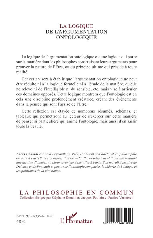 La logique de l'argumentation ontologique est une logique qui porte sur la manière dont les philosophes construisent leurs arguments pour prouver la nature de l'Être, ou du principe ultime qui préside à toute réalité. Cet écrit visera à établir que l'argumentation ontologique ne peut être réduite ni à la logique formelle ni à l'étude de la matière, qu'elle ne relève ni de l'intelligible ni du sensible, etc. mais vise à articuler ces domaines opposés. Cette logique montrera que l'ontologie est en cela une discipline profondément créatrice, créant des événements dans la pensée qui sont l'assise de l'Être. Cette réflexion est étayée de nombreux résumés, schémas, et tableaux qui permettront au lecteur de s'exercer sur cette manière de penser si particulière qui anime l'ontologie, mais aussi d'en saisir toute la beauté.
