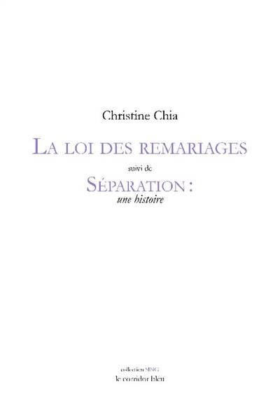 Autobiographie, minimaliste en vers, La loi des remariages nous fait revivre, à travers les yeux d'enfant de Christine Chia, le divorce de ses parents, la violence de sa mère et la mort de son père. Dans le Singapour des classes moyennes des années 1980, la poétesse, avec des vers sans ornement et d'une précision chirurgicale, nous fait traverser son enfance comme un cauchemar ponctué de brèves illuminations.