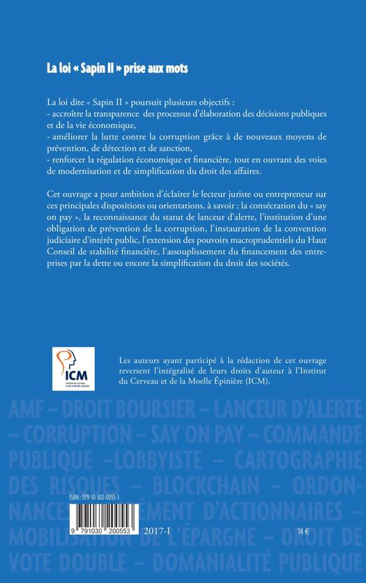 Cet ouvrage a pour ambition d éclairer le lecteur juriste ou entrepreneur sur ces principales dispositions ou orientations, à savoir : la consécration du « say on pay », la reconnaissance du statut de lanceur d'alerte, l'institution d'une obligation de prévention de la corruption, l'instauration de la convention judiciaire d intérêt public, l'extension des pouvoirs macroprudentiels du Haut Conseil de stabilité financière, l'assouplissement du financement des entreprises par la dette ou encore la simplification du droit des sociétés.