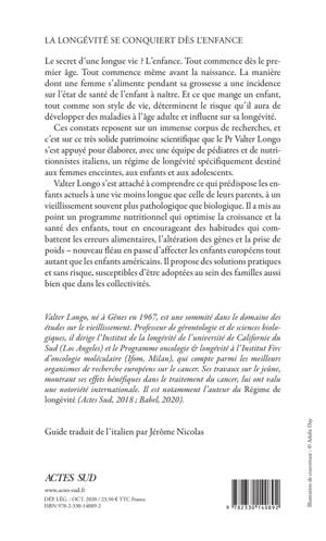Valter Longo s'est attaché à comprendre ce qui prédispose les enfants actuels à une vie moins longue que celle de leurs parents, à un vieillissement souvent plus pathologique que biologique. Il a mis au point un programme nutritionnel qui optimise la croissance et la santé des enfants, tout en encourageant des habitudes qui combattent les erreurs alimentaires, l'altération des gènes et la prise de poids - nouveau fléau en passe d'affecter les enfants européens tout autant que les enfants américains. Il propose des solutions pratiques et sans risque, susceptibles d'être adoptées au sein des familles aussi bien que dans les collectivités.