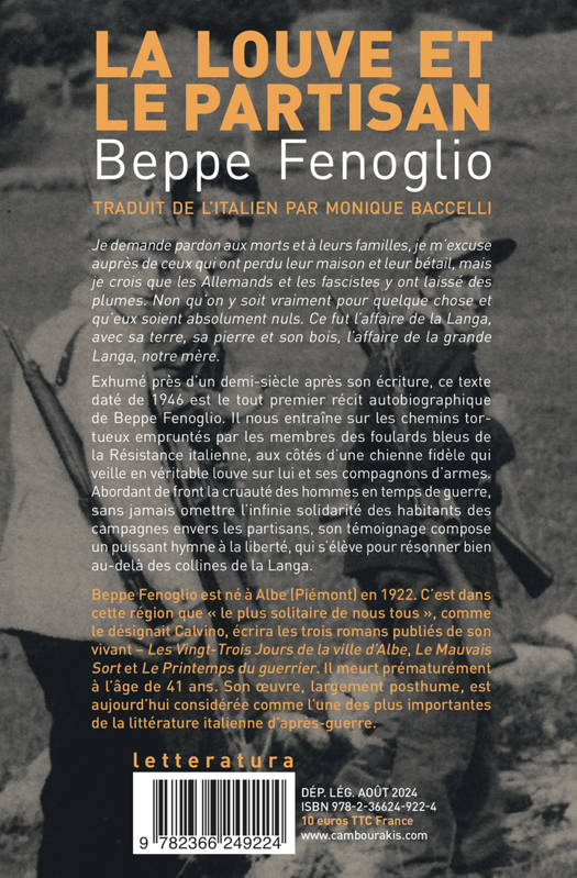 Exhumé près d'un demi-siècle après son écriture, ce texte daté de 1946 est le tout premier récit autobiographique de Beppe Fenoglio. Il nous entraîne sur les chemins tortueux empruntés par les membres des foulards bleus de la Résistance italienne, aux côtés d'une chienne fidèle qui veille en véritable louve sur lui et ses compagnons d'armes. Abordant de front la cruauté des hommes en temps de guerre, sans jamais omettre l'infinie solidarité des habitants des campagnes envers les partisans, son témoignage compose un puissant hymne à la liberté, qui s'élève pour résonner bien au-delà des collines de la Langa.