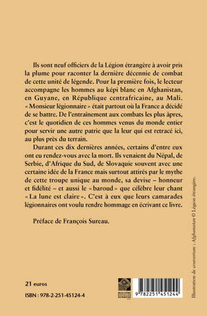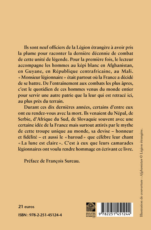 Ils sont neuf officiers de la Legion etrangere a avoir pris la plume pour raconter la derniere decennie de combat de cette unite de legende. Pour la premiere fois, le lecteur accompagne les hommes au kepi blanc en Afghanistan, en Guyane, en Republique centrafricaine, au Mali. Monsieur legionnaire etait partout ou la France a decide de se battre. De l'entrainement aux combats les plus apres, c'est le quotidien de ces hommes venus du monde entier pour servir une autre patrie que la leur qui est retrace ici, au plus pres du terrain.Durant ces dix dernieres annees, certains d'entre eux ont eu rendez-vous avec la mort. Ils venaient du Nepal, de Serbie, d'Afrique du Sud, de Slovaquie souvent avec une certaine idee de la France mais surtout attires par le mythe de cette troupe unique au monde, sa devise - honneur et fidelite - et aussi le baroud que celebre leur chant La lune est claire . C'est a eux que leurs camarades legionnaires ont voulu rendre hommage en ecrivant ce livre.