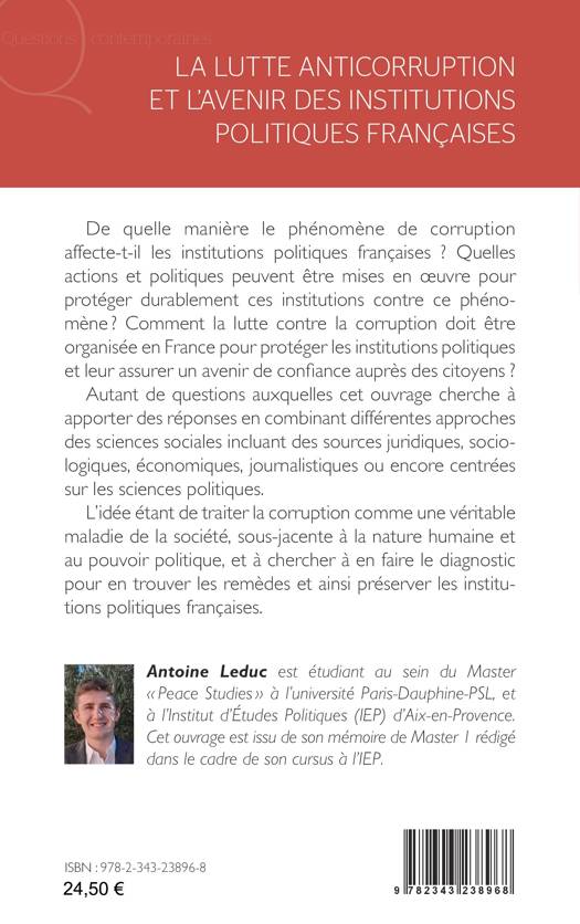 De quelle manière le phénomène de corruption affecte-t-il les institutions politiques françaises ? Quelles actions et politiques peuvent être mises en oeuvre pour protéger durablement ces institutions contre ce phénomène ? Comment la lutte contre la corruption doit être organisée en France pour protéger les institutions politiques et leur assurer un avenir de confiance auprès des citoyens ? Cet ouvrage cherche à apporter des réponses en combinant différentes approches des sciences sociales incluant des sources juridiques, sociologiques, économiques, journalistiques ou encore centrées sur les sciences politiques. La corruption y est traitée comme une véritable maladie de la société, sous-jacente à la nature humaine et au pouvoir politique, maladie dont les institutions politiques françaises doivent être préservées.