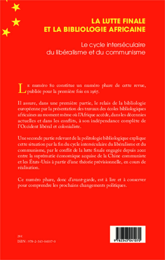 Ce numéro assure le relais de la bibliologie européenne par la présentation des travaux des écoles bibliologiques africaines au moment même où l'Afrique accède, dans les décennies actuelles et dans les conflits, à son indépendance complète de l'Occident libéral et colonialiste. La deuxième partie de politologie bibliologique analyse la lutte finale : une théorie prévisionnelle du conflit entre l'Amérique libérale (USA) et la Chine communiste au XXIe siècle.