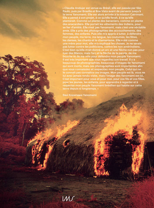 Du 30 janvier au 10 mai 2020, la Fondation Cartier pour l'art contemporain accueille une grande exposition personnelle de Claudia Andujar conçue par Thyago Nogueira, qui dirige le département de photographie contemporaine de l'Institut Moreira Salles de São Paulo, où elle a été initialement présentée. Considérée comme l'une des plus talentueuses photographes brésiliennes, Claudia Andujar a, tant par son engagement qu'à travers son oeuvre, joué un rôle fondamental pour la reconnaissance et la protection des Indiens Yanomami qui, au coeur de la forêt amazonienne, tentent de préserver leur mode de vie et leurs traditions chamaniques.