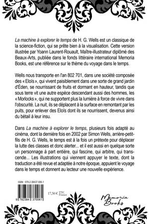 La machine à explorer le temps de H. G. Wells est un classique de la science-fiction, qui se prête bien à la visualisation. Cette version illustrée par Yoann Laurent-Rouault, Maître-illustrateur diplômé des Beaux-Arts, publiée dans le fonds littéraire international Memoria Books, est une référence sur le thème du voyage dans le temps. Wells nous transporte en l'an 802 701, dans une société composée des Eloïs, qui vivent paisiblement dans une sorte de grand jardin d'Éden, se nourrissant de fruits et dormant en hauteur, tandis que sous terre vit une autre espèce descendant aussi des hommes, les Morlocks, qui ne supportent plus la lumière à force de vivre dans l'obscurité. La nuit, ils se déplacent à la surface en remontant par les puits, pour enlever des Eloïs dont ils se nourrissent, devenus ainsi du bétail à leur insu. Dans La machine à explorer le temps, plusieurs fois adapté au cinéma, dont la dernière fois en 2002 par Simon Wells, arrière-petit-fils de H. G. Wells, le temps est à la fois un prétexte pour déplacer la lutte des classes et donc alerter... et il est aussi en quelque sorte un personnage à part entière, qui fascine, qui arbitre, qui transcende... Les illustrations qui viennent appuyer le texte, dont la traduction a été revue et adaptée à notre époque, appuient le voyage dans le temps et donnent au lecteur une nouvelle expérience.