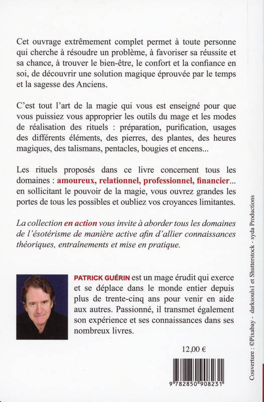 Cet ouvrage extrêmement complet permet à toute personne qui cherche à résoudre un problème, à favoriser sa réussite et sa chance, à trouver le bien-être, le confort et la confiance en soi, de découvrir une solution magique éprouvée par le temps et la sagesse des Anciens. C’est tout l’art de la magie qui vous est enseigné pour que vous puissiez vous approprier les outils du mage et les modes de réalisation des rituels : préparation, purification, usages des différents éléments, des pierres, des plantes, des heures magiques, des talismans, pentacles, bougies et encens... Les rituels proposés dans ce livre concernent tous les domaines : amoureux, relationnel, professionnel, financier... en sollicitant le pouvoir de la magie, vous ouvrez grandes les portes de tous les possibles et oubliez vos croyances limitantes. La collection "En action!" vous invite à aborder tous les domaines de l’ésotérisme de manière active afin d’allier connaissances théoriques, entraînements et mise en pratique.