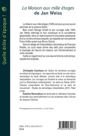 La Maison aux mille étages (1929) est plus qu'une oeuvre séminale de la science-fiction. Bien avant George Orwell et son ouvrage culte 1984, Jan Weiss interroge le tout numérique et la surveillance généralisée, dans un style empreint d'une poésie saisissante et d'un univers onirique singulier, qui rappelle son compatriote Franz Kafka autant que Bruno Schulz. Dans le sillage de l'interprétation sémantique de François Rastier, ce court essai donne des clefs pour comprendre la topologie de l'oeuvre (la maison), son fonctionnement et notre actualité. Il jette un regard neuf sur une oeuvre forte de notre temps, injustement éclipsée.