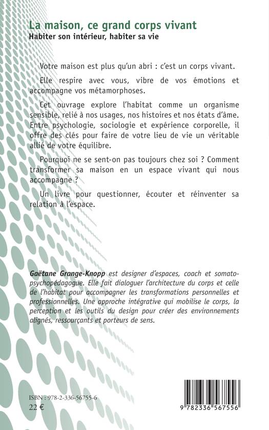 Votre maison est plus qu'un abri: c'est un corps vivant. Elle respire avec vous, vibre de vos émotions et accompagne vos métamorphoses. Cet ouvrage explore l'habitat comme un organisme sensible, relié à nos usages, nos histoires et nos états d'âme. Entre psychologie, sociologie et expérience corporelle, il offre des clés pour faire de votre lieu de vie un véritable allié de votre équilibre. Pourquoi ne se sent-on pas toujours chez soi ? Comment transformer sa maison en un espace vivant qui nous accompagne ? Un livre pour questionner, écouter et réinventer sa relation à l'espace.