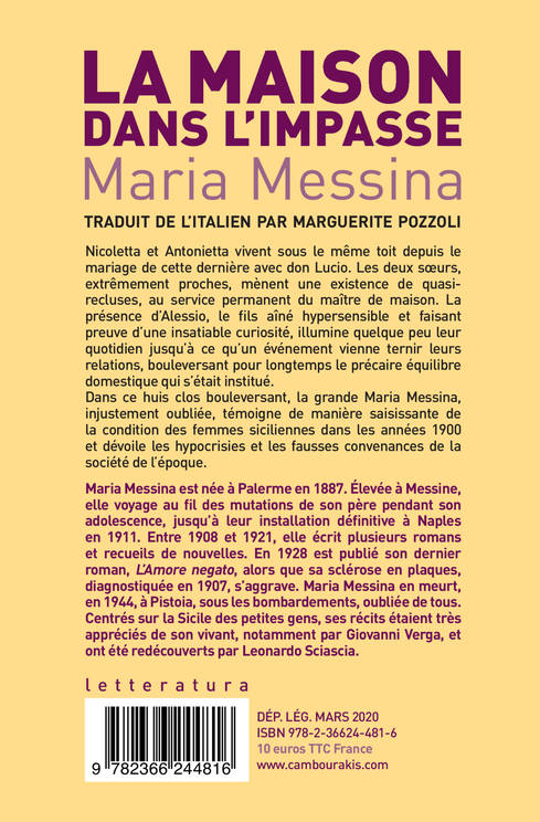 Première réédition d'un ouvrage de Maria Messina, grande autrice sicilienne du début du XXe siècle. Ce saisissant huis-clos familial en forme d'étrange « ménage à trois » (autour des personnages de deux soeurs qui cohabitent avec le mari et les enfants de l'aînée) décrit de manière implacable la situation des femmes siciliennes au début du XXe siècle et une certaine forme d'hypocrisie sociale installée. Une histoire poignante et cruelle servie par une écriture précise, analytique et suggestive.