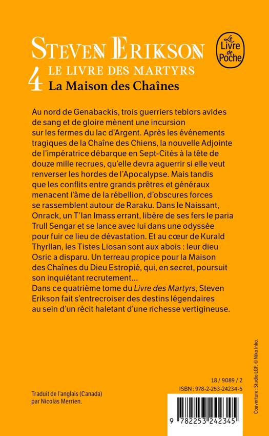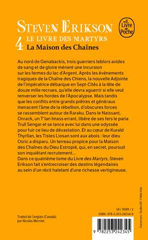Au nord de Genabackis, trois guerriers teblors avides de sang et de gloire mènent une incursion sur les fermes du lac d’Argent. Après les événements tragiques de la Chaîne des Chiens, la nouvelle Adjointe de l’impératrice débarque en Sept-Cités à la tête de douze mille recrues qu’elle devra aguerrir si elle veut renverser les hordes de l’Apocalypse. Mais tandis que les conflits entre grands prêtres et généraux menacent l’âme de la Rébellion, d’obscures forces se rassemblent autour de Raraku. Dans le Naissant, Onrack, un T’Ian Imass errant, libère de ses fers le paria Trull Sengar et se lance avec lui dans une odyssée pour fuir ce lieu de dévastation. Et au cœur de Kurald Thyrllan, les Tistes Liosan sont aux abois : leur dieu Osric a disparu. Un terreau propice pour la Maison des Chaînes du Dieu Estropié qui, en secret, poursuit son inquiétant recrutement… Dans ce quatrième tome du Livre des Martyrs Steven Erikson fait s’entrecroiser des destins légendaires au sein d’un récit haletant d’une richesse vertigineuse.