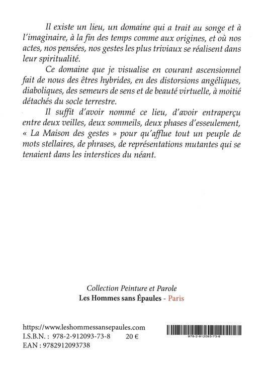 Il existe un lieu, un domaine qui a trait au songe et à l’imaginaire, à la fin des temps comme aux origines, et où nos actes, nos pensées, nos gestes les plus triviaux se réalisent dans leur spiritualité. Ce domaine que je visualise en courant ascensionnel fait de nous des êtres hybrides, en des distorsions angéliques, diaboliques, des semeurs de sens et de beauté virtuelle, à moitié détachés du socle terrestre. Il suffit d’avoir nommé ce lieu, d’avoir entraperçu entre deux veilles, deux sommeils, deux phases d’esseulement, « La maison des gestes » pour qu’afflue tout un peuple de mots stellaires, de phrases, de représentations mutantes qui se tenaient dans les interstices du néant.