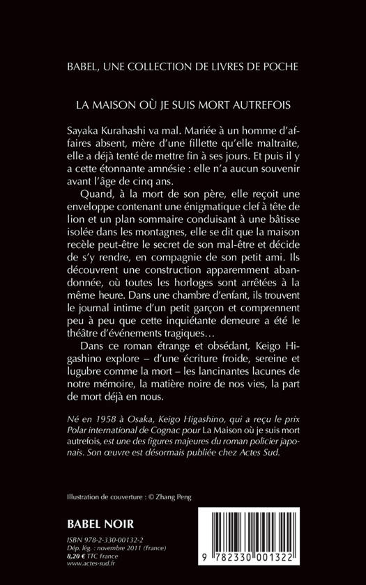 Sayaka Kurahashi va mal. Mariée à un homme absent, mère d'une fillette qu'elle maltraite, elle a déjà tenté de mettre fin à ses jours. Quand, à la mort de son père, elle reçoit une enveloppe contenant une énigmatique clef et un plan sommaire conduisant à une bâtisse isolée dans les montagnes, elle découvre une maison où toutes les horloges se sont arrêtées à la même heure. Cette inquiétante demeure semble vouloir la rappeler à des événements tragiques, oubliés depuis... Prix polar international de Cognac 2010.