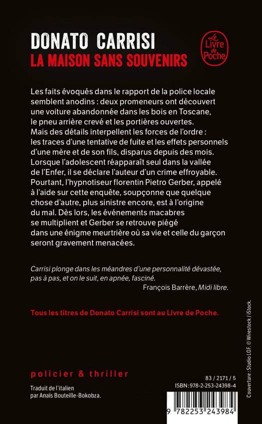 Les faits évoqués dans le rapport de la police locale semblent anodins : deux promeneurs découvrent une voiture abandonnée dans les bois en Toscane, le pneu arrière crevé et les portières ouvertes. Mais un détail interpelle les forces de l’ordre, qui remarquent les traces d’une tentative de fuite et les effets personnels d’une mère et de son fils, disparus depuis des mois. Lorsque l’adolescent réapparaît seul dans la vallée de l’Enfer, il se déclare l’auteur d’un crime effroyable. Pourtant, l’hypnotiseur florentin Pietro Gerber, appelé à l’aide sur cette enquête, soupçonne que quelque chose d’autre, plus sinistre encore, est à l’origine du mal. Dès lors, les événements macabres se multiplient et Gerber se retrouve piégé dans une énigme meurtrière où sa vie et celle du garçon seront gravement menacées.
