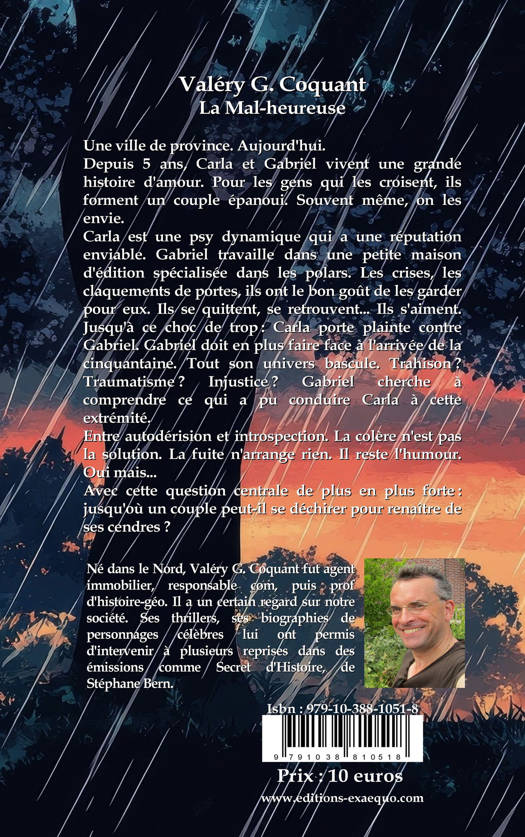 Carla est une psy dynamique qui a une réputation enviable. Gabriel travaille dans une petite maison d'édition spécialiste dans les polars. Les crises, les claquements de portes, ils ont le bon goût de les garder pour eux. Ils se quittent, se retrouvent... Ils s'aiment. Jusqu'à ce choc de trop : Carla porte plainte contre Gabriel. Gabriel doit en plus faire face à l'arrivée de la cinquantaine. Tout son univers bascule. Trahison ? Traumatisme ? Injustice ? Gabriel cherche à comprendre ce qui a pu conduire Carla à cette extrémité.