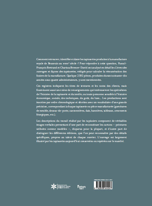 Comment renouveler un sujet à partir de la relecture d’une source d’archives ? C’est la question que se sont posés les auteurs de ce livre qui touche à l’un des plus importants fonds du patrimoine textile européen, les Livres des Ouvrages et Façons des Tapisseries, rédigés pour calculer la rémunération des lissiers de la manufacture de Beauvais. Il s’agissait de quelque 2 392 pièces produites sous quatre administrateurs de manufacture consécutifs s’étalant sur soixante-dix années du XVIIe siècle. Les registres sont désormais singuliers, ils constituent l’unique ressource subsistante de ce qui était autrefois une industrie florissante. Ils ont été consultés au début du xxe siècle par Jules Badin, peintre et administrateur de la Manufacture, qui, dans son étude fondatrice sur les productions de cet établissement, y a retenu des listes de titres de tentures et de noms de clients. Cette ressource contient toutefois une mine de renseignements susceptible d’intéresser non seulement les spécialistes de l’histoire de la tapisserie, mais toute personne faisant des recherches dans divers domaines historiques et artistiques (histoire économique, sociale, des techniques, du goût, de l’ameublement, du luxe et de la consommation) ou ayant un intérêt pour des questions d’intermédialité, de transposition d’un médium dans un autre. Toutes les productions y sont inscrites par ordre chronologique et décrites, avec un vocabulaire d’une grande précision, correspondant à chaque tapisserie ou garniture de meubles et autres pièces manufacturées (dessus-de-porte, cantonnières, dais, bannières, tableaux, ornements liturgiques, etc.). Les descriptions du travail effectué par les tapissiers composent ainsi de véritables images verbales permettant d’une part de reconstituer les cartons, c’està- dire les peintures utilisées comme modèles, disparues pour la plupart, et d’autre part d’identifier les différentes éditions, puisqu’un carton est le plus souvent tissé en plusieurs exemplaires, que l’on peut reconnaitre par des détails spécifiques à chaque édition, dus au talent propre à chaque ouvrier, ce dernier point venant souligner la part de collectif qu’il y a dans le métier de tapissier. Cette ressource a été condensée pour rendre compte au mieux des cartons et des différents tissages réalisés.