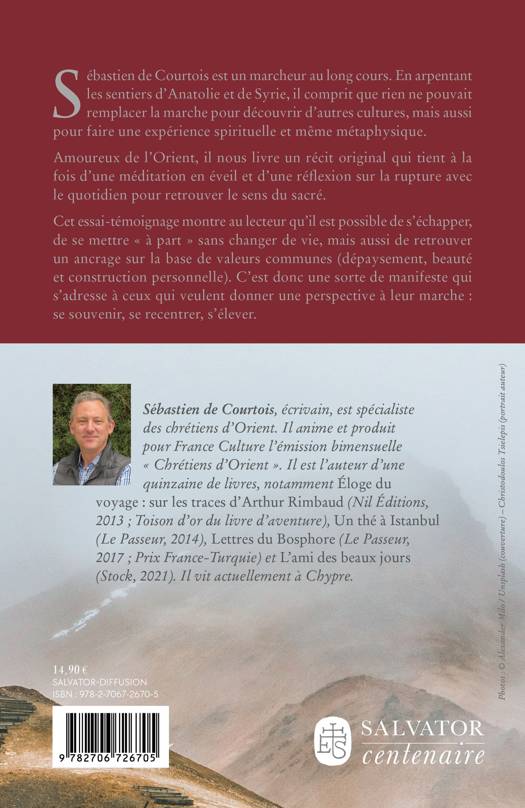 Sébastien de Courtois est un marcheur au long cours. En arpentant les sentiers d'Anatolie et de Syrie, il comprit que rien ne pouvait remplacer la marche pour découvrir d'autres cultures, mais aussi pour faire une expérience spirituelle et même métaphysique. Amoureux de l'Orient, il nous livre un récit original qui tient à la fois d'une méditation en éveil et d'une réflexion sur la rupture avec le quotidien pour retrouver le sens du sacré. Cet essai-témoignage montre au lecteur qu'il est possible de s'échapper, de se mettre « à part » sans changer de vie, mais aussi de retrouver un ancrage sur la base de valeurs communes (dépaysement, beauté et construction personnelle). C'est donc une sorte de manifeste qui s'adresse à ceux qui veulent donner une perspective à leur marche : se souvenir, se recentrer, s'élever. AUTEUR Sébastien de Courtois, écrivain, est spécialiste des chrétiens d'Orient. Il anime et produit pour France Culture l'émission bimensuelle « Chrétiens d'Orient ». Il est l'auteur d'une quinzaine de livres, notamment Éloge du voyage : sur les traces d'Arthur Rimbaud (Nil Éditions, 2013 , Toison d'or du livre d'aventure), Un thé à Istanbul (Le Passeur, 2014), Lettres du Bosphore (Le Passeur, 2017 , Prix France-Turquie) et L'ami des beaux jours (Stock, 2021). Il vit actuellement à Chypre.