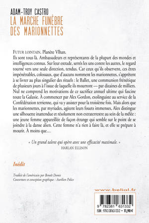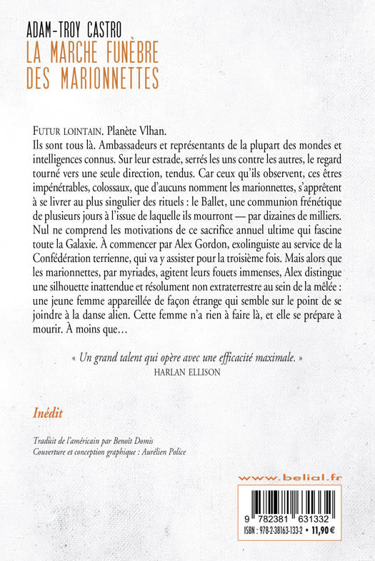 Futur lointain. Planète Vlhan. Ils sont tous là. Ambassadeurs et représentants de la plupart des mondes et intelligences connus. Sur leur estrade, serrés les uns contre les autres, le regard tourné vers une seule direction, tendus. Car ceux qu’ils observent, ces êtres impénétrables, colossaux, que d’aucuns nomment les marionnettes, s’apprêtent à se livrer au plus singulier des rituels : le Ballet, une communion frénétique de plusieurs jours à l’issue de laquelle ils mourront — par dizaines de milliers. Nul ne comprend les motivations de ce sacrifice annuel ultime qui fascine toute la Galaxie. À commencer par Alex Gordon, exolinguiste au service de la Confédération terrienne, qui va y assister pour la troisième fois. Mais alors que les marionnettes, par myriades, agitent leurs fouets immenses, Alex distingue une silhouette inattendue et résolument non extraterrestre au sein de la mêlée : une jeune femme appareillée de façon étrange qui semble sur le point de se joindre à la danse alien. Cette femme n’a rien à faire là, et elle se prépare à mourir. À moins que…