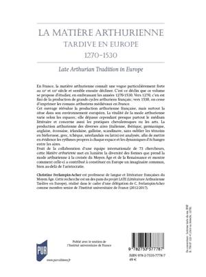 Fruit de la collaboration d’une équipe internationale de 73 chercheurs, ce livre met en lumière la diversité des formes que prend la mode arthurienne à la croisée du Moyen Âge et de la Renaissance. Il montre comment cette matière a contribué à constituer en Europe un imaginaire commun, bien au-delà de l’aristocratie. La production arthurienne des diverses aires (italienne, ibérique, germanique, anglaise, écossaise, irlandaise, galloise, scandinave, sans oublier les témoins en biélorusse, grec, tchèque, néerlandais ou latin) est analysée afin de mettre en évidence les rythmes propres à chaque espace et les dynamiques d’échanges entre les aires.