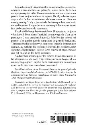Les arbres sont innombrables, marquant les paysages, arrives d'eux-memes ou plantes, aussi bien dans les campagnes qu'en ville. Ils nous environnent sans que nous parvenions toujours a les distinguer. Or, il y a beaucoup a apprendre de leurs varietes et de leurs nuances. Ils nous enseignent qu'il n'y a jamais de fin a ce que l'on peut voir en se disposant a regarder une racine qui devient un tronc fait de branches et de rameaux.Eryck de Rubercy les connait bien. Il a presque toujours vecu a cote d'eux dans l'activite de sauvegarde d'un parc paysager. Cette proximite avec La Matiere des arbres lui permet d'en parler avec la complicite de grands ecrivains. Temoin sensible de leur vie, son essai initie le lecteur a ce qui fait, au rythme des saisons et suivant les essences, leur specificite botanique: cette force sourde et mysterieuse qui est en eux et les tient debout .Sa dilection intime pour les arbres le fait etre aussi le fin descripteur du parc d'agrement au sein duquel il les cotoie chaque jour: la plus belle connaissance des arbres etant celle de vivre dans leur proximite.