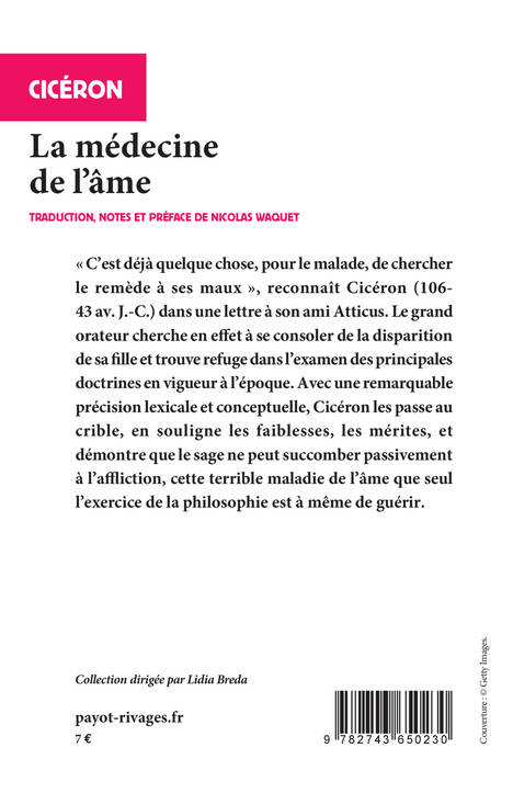 Conférence fictive, ce recueil traite autant de la mort, de la douleur, du chagrin, des affects ou du bonheur qui promet la vertu. En deuil de sa fille, Cicéron s'exhorte lui-même à surmonter la mort et la peine par la réflexion et la maîtrise de soi. Souffrance physique et souffrance morale étant étroitement liées, nous proposons ici une nouvelle traduction du livre III des fameuses «Tusculanes». En disciple des stoïciens, le célèbre orateur prône la fermeté et la force de caractère pour nous dire que la philosophie reste la meilleure médecine de l'âme.