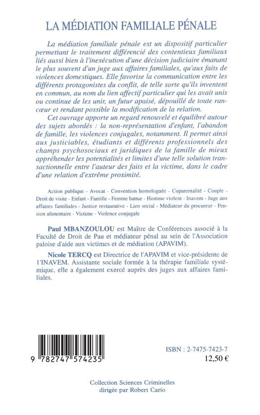 Le terme de médiation familiale pénale s'emploie lorsque le contentieux traité en médiation pénale relève du domaine familial (violences domestiques, non respect du droit de visite ou de garde de l'enfant, contentieux sur l'exercice de l'autorité parentale conjointe, abandon de famille). Sous l'égide d'un tiers, il s'agit de mettre en relation l'auteur et la victime afin de trouver un accord de réparation, mais aussi de restaurer un lien. Voici une réflexion sur une procédure de justice restaurative ou réparatrice.