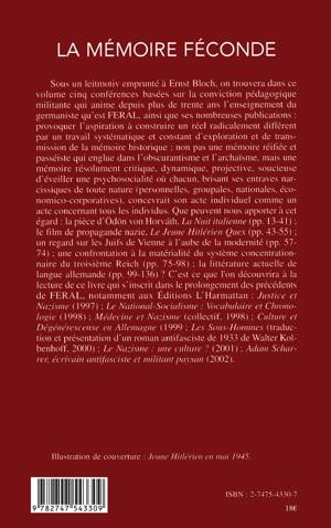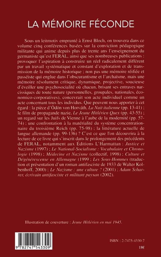 Sous un leitmotiv emprunté à Ernst Bloch, on trouvera dans ce volume cinq conférences basées sur la conviction pédagogique militante qui anime depuis plus de trente ans l'enseignement du germaniste qu'est FERAL, ainsi que ses nombreuses publications : provoquer L'aspiration à construire un réel radicalement différent par un travail systématique et constant d'exploration et de transmission de la mémoire historique ; non pas une mémoire réifiée et passéiste qui englue dans l'obscurantisme et L'archaïsme, mais une mémoire résolument critique, dynamique, projective, soucieuse d'éveiller une psychosocialisé où chacun, brisant ses entraves narcissiques de toute nature (personnelles, groupales, nationales, économico corporatives), concevrait son acte individuel comme un acte concernant tous les individus.