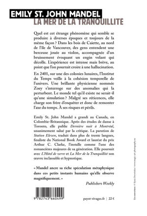 Emily St. John Mandel renouvelle le thème classique du voyage dans le temps à sa manière unique, dans une histoire envoûtante qui entremêle époques et personnages jusqu'au vertige. Quel est cet étrange phénomène qui semble se produire à diverses époques et toujours de la même façon ? Dans les bois de Caiette, au nord de l'île de Vancouver, des gens entendent une berceuse jouée au violon, accompagnée d'un bruissement évoquant un engin volant qui décolle. L'expérience est intense mais brève, au point que l'on pourrait croire à une hallucination. En 2401, sur une des colonies lunaires, l'institut du Temps veille à la cohésion temporelle de l'univers. Une brillante physicienne nommée Zoey s'interroge sur des anomalies qui la perturbent. Le monde tel qu'il existe ne serait-il qu'une simulation ?