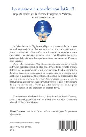 La Sainte Messe de l'Église catholique est le centre de la vie de tous les fidèles qui croient en Dieu qui s'est fait homme en la personne de Jésus. Depuis deux mille ans c'est un miracle, un mystère, un coeur à coeur entre Dieu et chaque personne; c'est l'Invisible qui se manifeste, qui descend du Ciel et se donne en nourriture aux enfants de Dieu que nous sommes. Dans ce livre atypique, Marie Moreau a souhaité donner la parole à diverses personnes pour qu'elles nous livrent leurs regards croisés, différents et complémentaires, sur leur parcours d'Église durant ces dernières décennies, spécialement en ce qui concerne la liturgie qui a fait l'objet et continue de faire l'objet de beaucoup de controverses. En espérant que La messe à en perdre son latin ?! aidera à ne pas perdre le nord, mais au contraire que cet ouvrage apportera la paix et témoignera de la porte ouverte sur la Vérité que la foi catholique constitue pour toutes les personnes qui cherchent un chemin de vie.