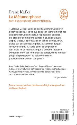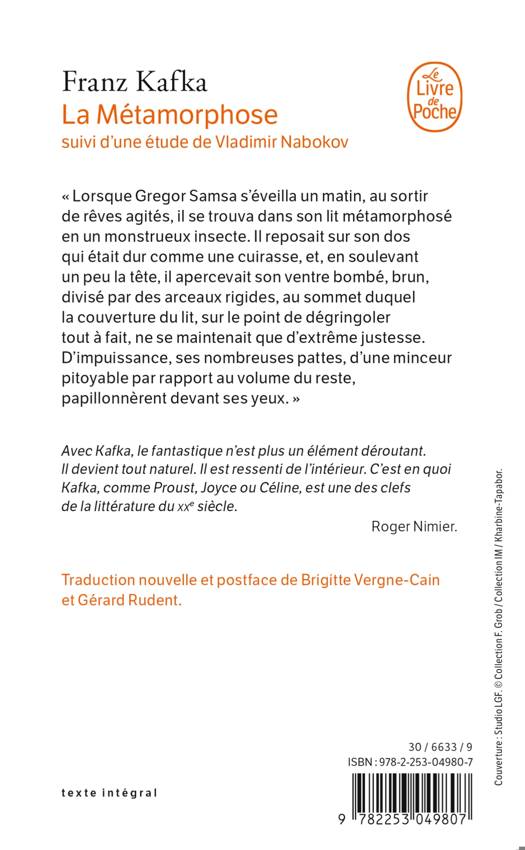 « Lorsque Gregor Samsa s'éveilla un matin, au sortir de rêves agités, il se trouva dans son lit métamorphosé en un monstrueux insecte. Il reposait sur son dos qui était dur comme une cuirasse, et, en soulevant un peu la tête, il apercevait son ventre bombé, brun, divisé par des arceaux rigides, au sommet duquel la couverture du lit, sur le point de dégringoler tout à fait, ne se maintenait que d'extrême justesse. D'impuissance, ses nombreuses pattes, d'une minceur pitoyable par rapport au volume du reste, papillonnèrent devant ses yeux. « Qu'est-il advenu de moi ? » pensa-t-il. Ce n'était pas un rêve. Sa chambre, une vraie chambre humaine quoiqu'un peu trop petite, était là, paisible entre les quatre murs familiers... »