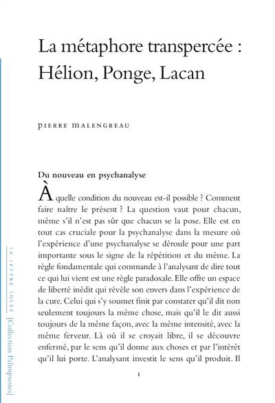 Il y a dans la parole analysante une forme d'inertie et de polarisation qui se répète et que l'expérience d'une psychanalyse rend incandescente. Il est alors légitime de se demander s'il est possible d'y introduire du nouveau. La référence que Lacan fait à Francis Ponge éclaire ce que serait un nouvel usage des mots, un usage qui permettrait de rejoindre de temps en temps ce qu'il y a de réel, d'insensé et d'ininterprétable dans toute parole. Ponge, dans un texte qui s'intitule "Hélion", aborde cette quest