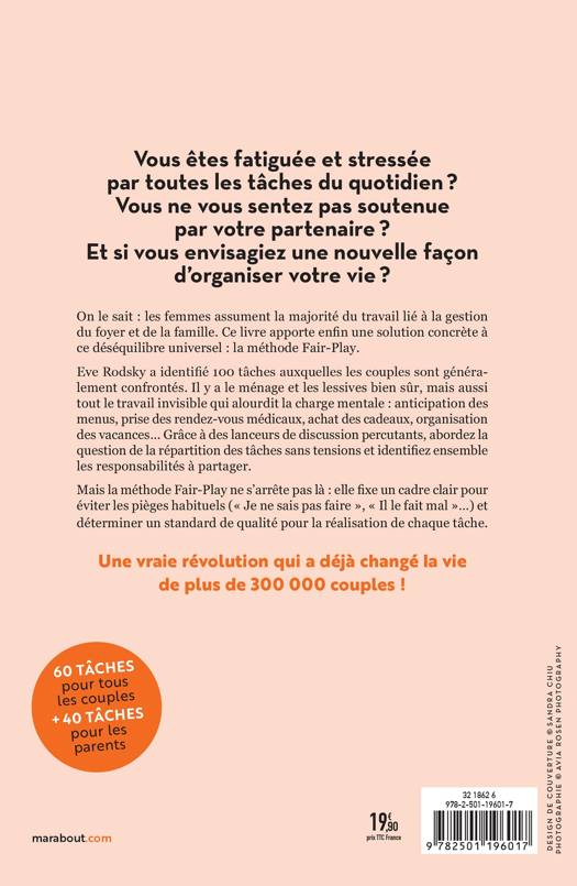 On le sait : les femmes assument la majorité du travail lié à la gestion du foyer et de la famille. Ce livre apporte enfin une solution concrète à ce déséquilibre universel : la méthode Fair-Play. Eve Rodsky a identifié 100 tâches auxquelles les couples sont généralement confrontés. Il y a le ménage et les lessives bien sûr, mais aussi tout le travail invisible qui alourdit la charge mentale : anticipation des menus, prise des rendez-vous médicaux, achat des cadeaux, organisation des vacances... Grâce à des lanceurs de discussion percutants, abordez la question de la répartition des tâches sans tensions et identifiez ensemble les responsabilités à partager.
