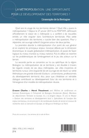 Quel sera le visage de nos territoires demain ? Quel rôle y jouera la métropolisation ? Depuis la loi MAPTAM, définissant officiellement le statut de « métropole », a conféré à de nouvelles entités un rôle singulier dans l'architecture territoriale. Mais cette « métropolisation des territoires » suscite bien des questions. Sont abordés la métropolisation et ses enjeux d'un point de vue général, et le cas spécifique de la région Bretagne étudiée à travers les regards croisés de ses deux métropoles, ses villes moyennes et ses territoires ruraux.
