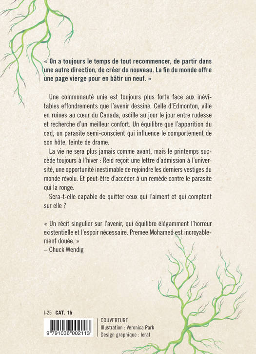 Une communauté unie est toujours plus forte face aux inévitables effondrements que l'avenir dessine. Celle d'Edmonton, ville en ruines au cœur du Canada, oscille au jour le jour entre rudesse et recherche d'un meilleur confort. Un équilibre que l'apparition du cad, un parasite semi-conscient qui influence le comportement de son hôte, teinte de drame. La vie ne sera plus jamais comme avant, mais le printemps succède toujours à l'hiver : Reid reçoit une lettre d'admission à l'université, une opportunité inestimable de rejoindre les derniers vestiges du monde révolu. Et peut-être d'accéder à un remède contre le parasite qui la ronge. Sera-t-elle capable de quitter ceux qui l'aiment et qui comptent sur elle ?