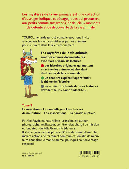 Tourou, renardeau rusé et malicieux, nous invite à découvrir les astuces utilisées par les animaux pour survivre dans leur environnement. Il nous raconte d'abord une histoire dont les personnages sont des animaux. Ensuite il explique en détail le sujet : la migration, le camouflage, les réserves de nourriture, les associations, la parade nuptiale. En fin de chapitre figurent les cartes d'identité des animaux présents dans les cinq histoires du livre. Cet ouvrage ludique et pédagogique, magnifiquement illustré, permet à toute la famille de découvrir et de mieux comprendre la vie des animaux. Trois tomes composent à ce jour cette collection jeunesse qui s'adresse aux enfants de 7 à 12 ans et à leurs parents ou grands-parents.