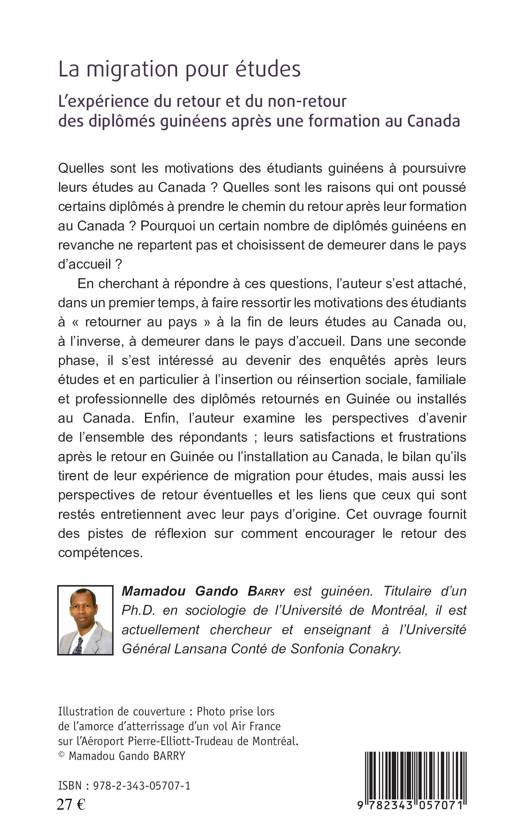 Quelles sont les motivations des étudiants guinéens à poursuivre leurs études au Canada ? Quelles raisons ont poussé certains diplômés à prendre le chemin du retour après leur formation au Canada et d'autres à demeurer dans le pays d'accueil ? Après avoir répondu à ces questions, l'auteur s'est intéressé à l'insertion ou réinsertion sociale, familiale et professionnelle des diplômés retournés en Guinée ou installés au Canada.