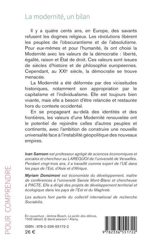 Il y a quatre cents ans, en Europe, des savants refusent les dogmes religieux. Les révolutions libèrent les peuples de l'obscurantisme et de l'absolutisme. Pour eux-mêmes et pour l'humanité, ils ont choisi la Modernité avec les valeurs de la démocratie: liberté, égalité, raison et État de droit. Ces valeurs sont issues de siècles d'histoire et de philosophie européennes. Cependant, au XXIe siècle, la démocratie se trouve menacée. La Modernité a été déformée par des vicissitudes historiques, notamment son appropriation par le capitalisme et l'individualisme. Elle est toujours bien vivante, mais elle a besoin d'être relancée et restaurée hors du contexte occidental. En se propageant au-delà des identités et des frontières, les valeurs d'une Modernité renouvelée ont le potentiel de rejoindre celles d'autres peuples et continents, avec l'ambition de construire une nouvelle universalité face à l'instabilité géopolitique des nouveaux empires.