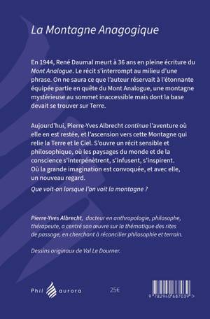 En 1944 René Daumal meurt à 36 ans en pleine écriture du Mont Analogue Le récit s’interrompt au milieu d’une phrase On ne saura ce que l’auteur réservait à l’étonnante équipée partie en quête du Mont Analogue une montagne mystérieuse au sommet inaccessible mais dont la base devait se trouver sur Terre Ce roman spirituel inachevé devient un livre culte réédité de nombreuses fois et ayant inspiré nombre d'oeuvres cinéma musique arts plastiques Cependant très peu de suites ont été données sous forme littéraire ou d'essaiPierreYves Albrecht relié à la quête philosophique de Daumal et luimême connaisseur de l'alpinisme ayant vécu toute sa vie dans les Alpes reprend l’aventure où elle en est restée dans La Montagne Anagogique et la poursuit sous une forme de récit philosophique Dans lequel on interroge l’ascension vers cette Montagne qui relie la Terre et le Ciel Le texte navigue entre récit littéraire très imagé sensible et méditations philosophiques métaphysiques convoquant à la fois de grandes traditions spirituelles et les découvertes de la physique quantique Ce livre est unique car très peu d'auteurs se sont essayés à poursuivre l'aventure devenue culte du Mont Analogue PierreYves Albrecht réunit ici des décennies de réflexion philosophique mais aussi de mise en pratique initiatique afin de réaliser un texte unique en son genre qui se base sur un récit foisonnant d'images et de sensibilité imaginal pour développer des thèses métaphysiques très puissantes Il interroge notamment les notions de temps d'espace de causalité et du pouvoir de l'imagination humaine lorsqu'elle sait être orientée dans une direction adéquate Le symbolisme spirituel de la Montagne et de l'ascension que l'on retrouve dans de très nombreuses traditions est bien sûr très présent et particulièrement inspirant